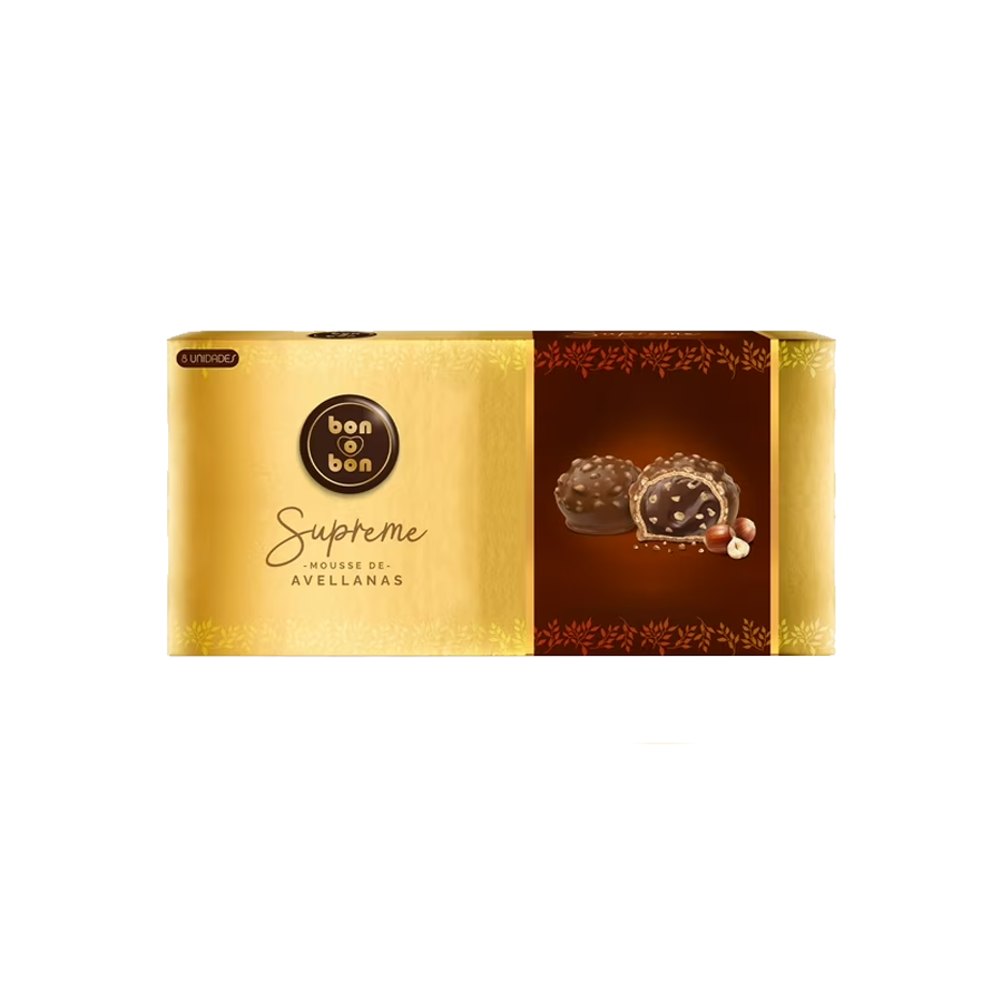 Bon o Bon Supreme es una versión premium del clásico Bon o Bon, con un relleno suave de mousse de avellanas, recubierto por chocolate con trocitos crocantes de avellana. Un bombón intenso, cremoso y elegante, ideal para regalar, compartir o disfrutar como indulgencia personal.