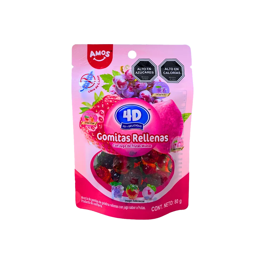 Gomitas 4D rellenas con jugo de frutas, con formas y colores llamativos que combinan una textura suave por fuera y un centro líquido lleno de sabor. Una experiencia dulce y jugosa en cada bocado, ideal para quienes buscan algo diferente a las gomitas tradicionales.